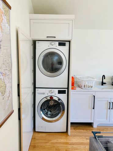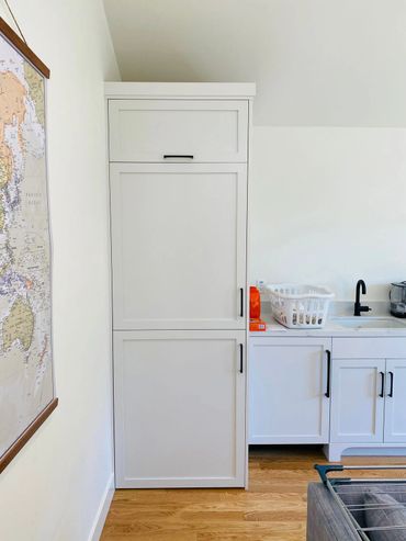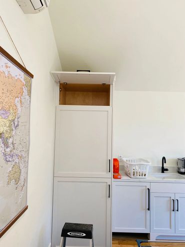 Beautiful wall to wall cabinets with doors and drawers, open shelving, and Murphy bed.