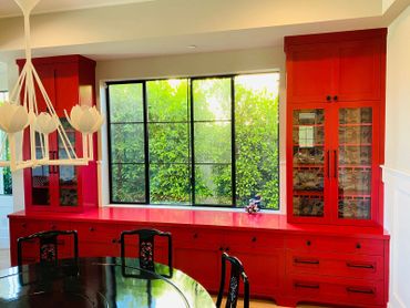 Custom wall to wall dark color cabinets with a window and bench in the middle and an oval table