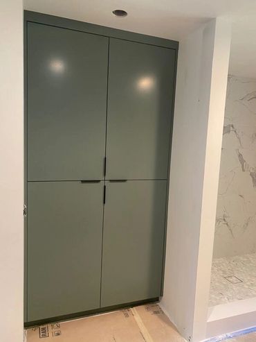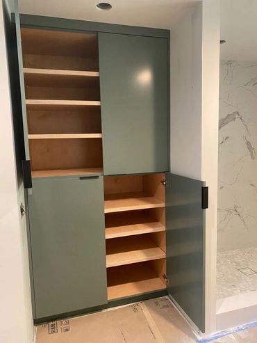 Small custom dark cabinet in a niche with open shelving and LED lighting